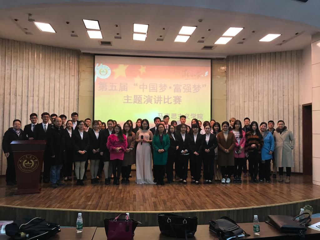 党的十九大提出要建设富强民主文明和谐美丽的社会主义现代化强国,为引导大学生全方位、系统化、多角度地认识这一目标任务,实现党的十九大报告与概论课教学的精准对接,概论教研室在全校概论课教学班级开展“中国梦•富强梦”主题演讲比赛,9月初,概论课12位任课教师在全校23个教学大班进行宣传动员,从选题、内容和课件制作等方面给予精心指导,共计约60个小组提交参赛资料,10-11月,任课教师首先在班级组织海选,遴选出25组进入全校范围内的初赛,最终选定10组进入决赛。在整个演讲比赛的组织开展中,学院领导高度重视、大力支持,任课教师精诚团结,通力合作。系列活动的开展有助于引导大学生深刻理解“两个一百年”奋斗目标,使他们更深刻地领悟中国共产党人的初心和使命,即“为中国人民谋幸福,为中华民族谋复兴”,对实现党的十九大精神从“入耳”到“入心”的升华起到了引领示范作用。