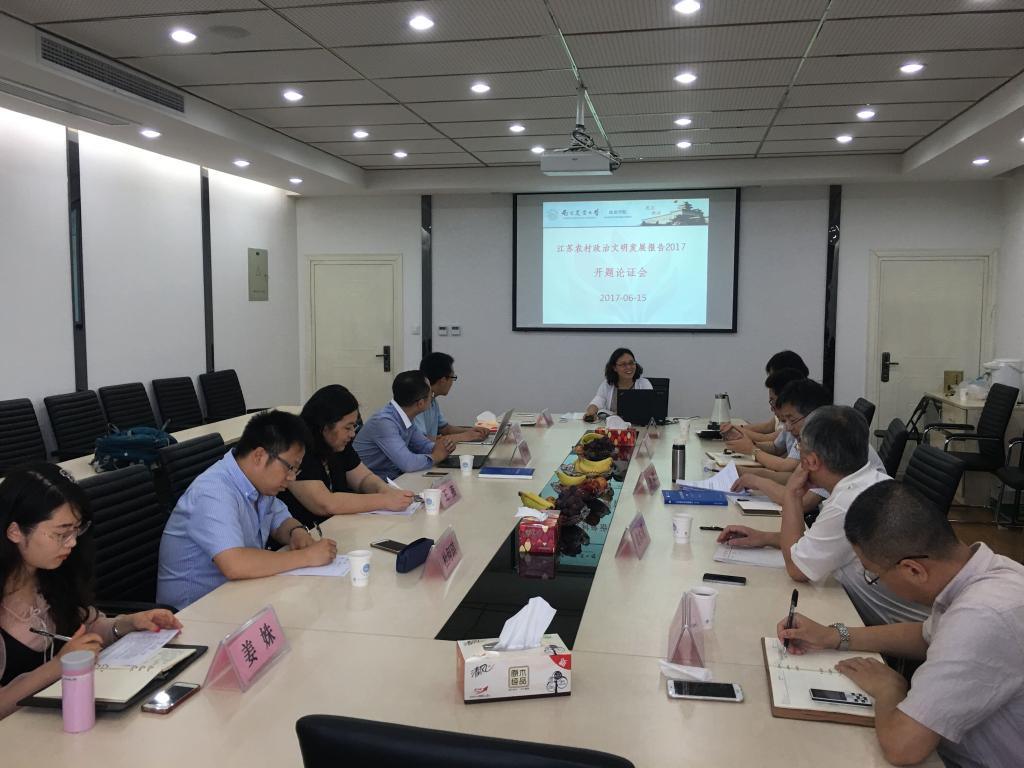 2017年6月15日,政治学院联合江苏省民政厅、东南大学人文学院、成人动漫 人文社科处,成功召开了“江苏农村政治文明发展报告2017”开题论证会,并邀请了相关专家——省民政厅基层政权和社区建设处孙斌处长、新农村发展研究院陈巍主任、社科处处长黄水清、副处长卢勇、东南大学人文学院社会学系胡伟和王化起博士等进行指导。