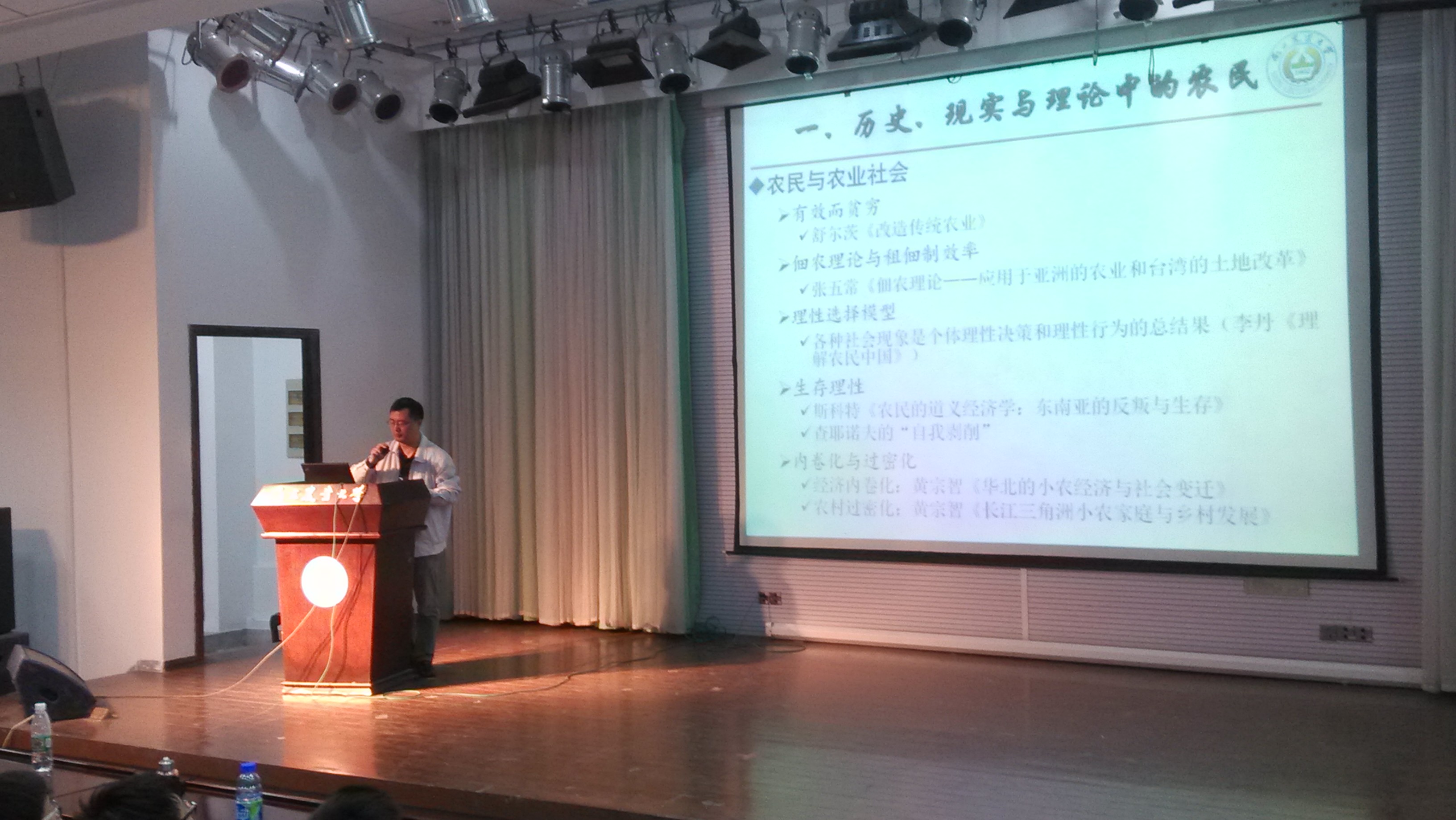 陈会广教授首先以历史、现实与理论中的农民为切入点,分析了我国农民在不同历史时期的不同特点,延伸至现代社会一个非常普遍而又心酸的话题—农民工,通过一系列图片展示了农民工在中国的现状,形象地介绍了农民工作为农民中的特殊群体的历史发展进程:盲流—临时工—进城务工农民—农民工以及农民工的生活工作现状。接着陈教授从生产资料占有层面介绍了农民与土地之间的关系,指出农民在土地制度变迁中的作用。在农民、农民工以及农村土地现有关系的基础上,陈教授提出了一个现实性问题:“如何跨国城镇的门槛?如何破解城乡二元” ?通过此次报告会,同学们从中了解到农民与土地、农民与制度变迁的关系,对农民在历史、现实发展中的作用也认识得更加透彻。