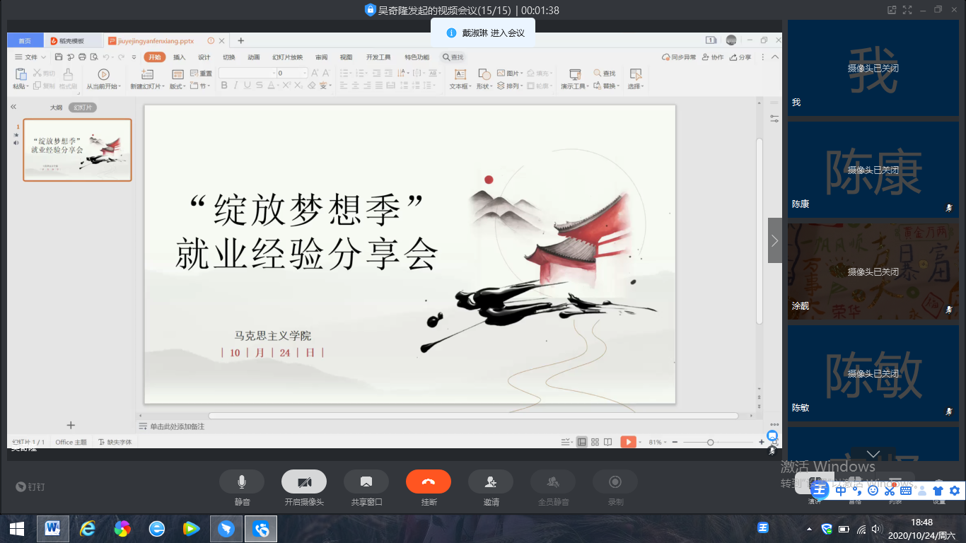成人动漫 于10月24日晚七点组织全体学生开展“绽放梦想季”就业经验分享会,此次分享会通过钉钉进行线上交流,邀请到成人动漫 2020届毕业生山西中医药大学思政课教师贺扬和江苏省选调生陈乙童进行经验分享,活动由新媒体中心主任吴奇隆主持,马院全体学生共同参会。