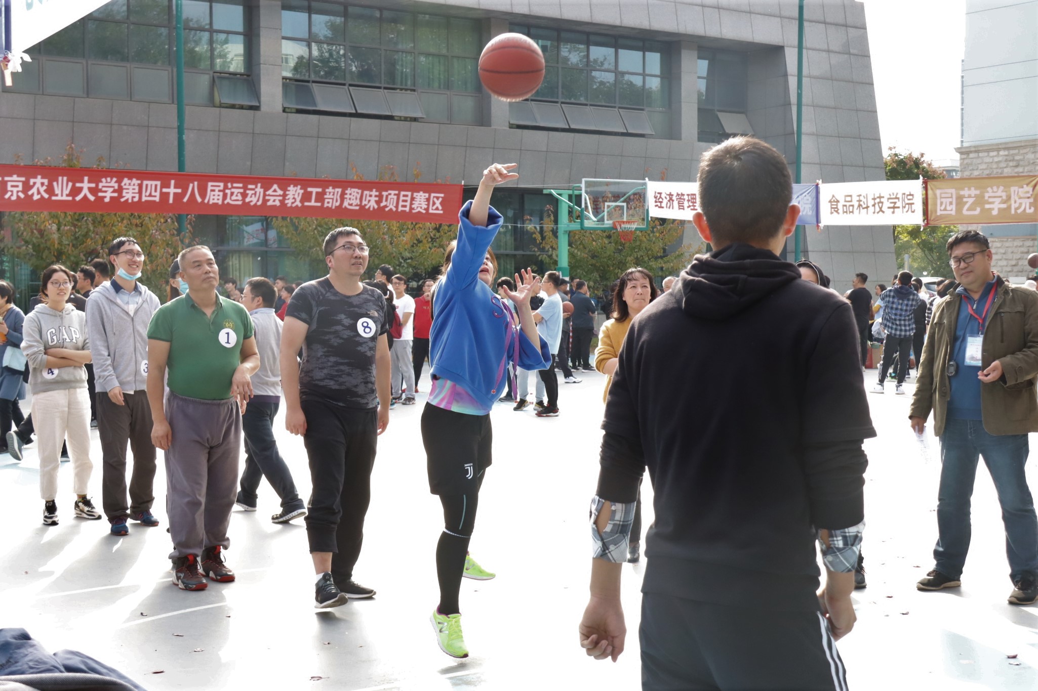 八位老师各显神通,篮球在他们手中或高抛,或旋转,在一次次井然有序的投篮中,篮球仿佛有了生命一般,一次又一次进入球框,此起彼伏的加油声中,是马院老师们团结一心、顽强拼搏的意志体现。