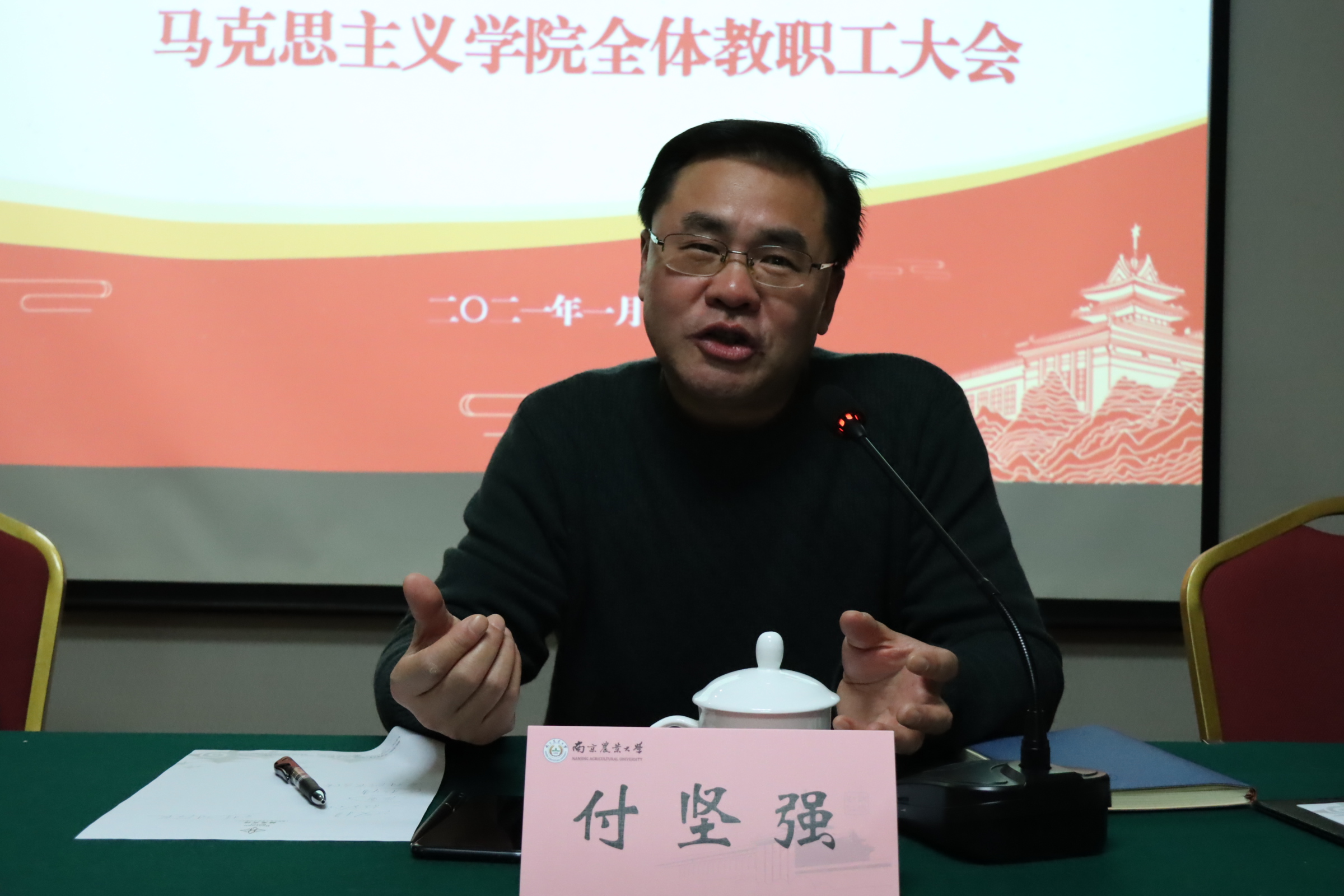 付坚强做会议总结,他指出,2020年面临疫情肆虐和加强疫情防控,同时处在“两个一百年”历史交汇点,决战脱贫攻坚、全面建成小康社会,全面开启十四五规划的“不平凡的一年”,学院在教学改革、理论宣讲、社会服务取得了可喜成绩,希望全院教职工在新的一年里能够再接再厉、再创佳绩。