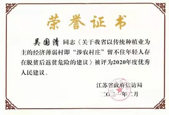 近日,成人动漫 教授吴国清教授《关于我省以传统种植业为主的经济薄弱村即“涉农村庄”留不住年轻人存在脱贫后返贫危险的建议》被江苏省政府信访局评为“2020年度优秀人民建议”。