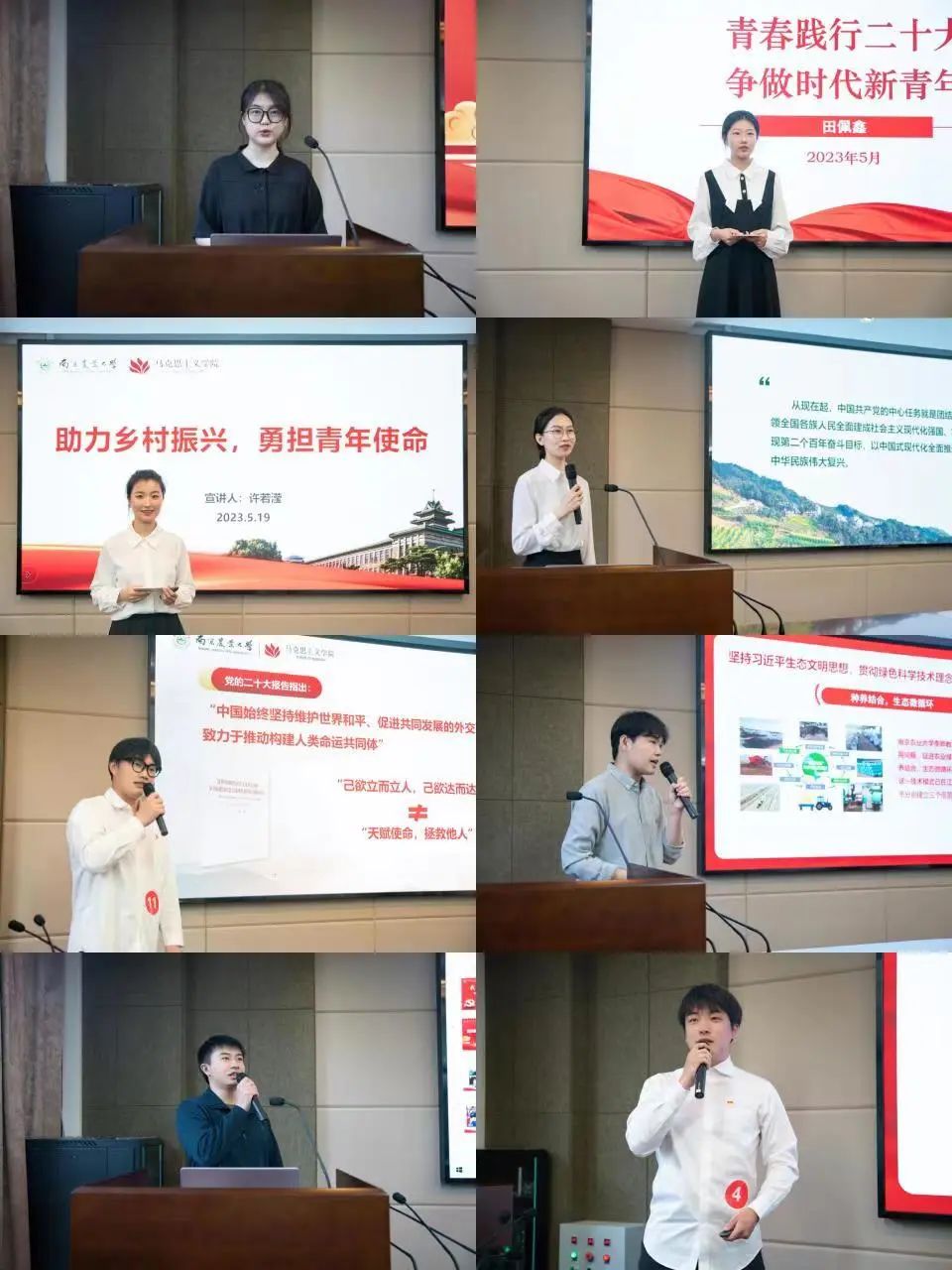 2023年5月19日下午,“我学我讲新思想” 学习贯彻习近平新时代中国特色社会主义思想微宣讲比赛在党校教室顺利召开,来自南农马院和陆军工程大学的11位学员参加了比赛。校党委组织部副部长许承保,党委宣传部、党委教师工作部副部长陈洁,党委研究生工作部副部长林江辉,信息管理学院党委副书记王春伟,成人动漫 党委副书记杨博担任评委,比赛指导老师代表、成人动漫 副教授陈蕊和学院思政教育主管张嫦娥参加活动,成人动漫 研究生与陆军工程大学学员代表观摩了比赛。