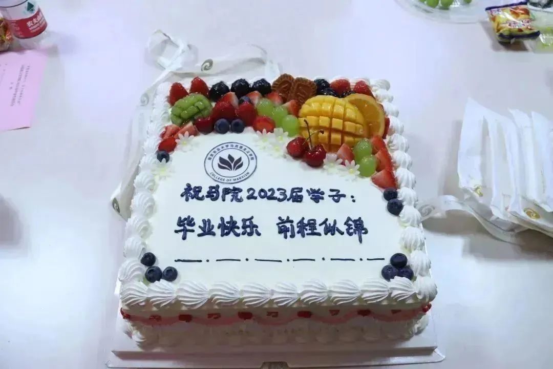 座谈会最后,在大家互相鼓励祝福的话语中,在青春洋溢的欢笑声中,与会师生共同分享了“毕业快乐,前程似锦”毕业蛋糕,精致清晰的马院logo十分醒目,蛋糕不仅是共同品尝的一份甜蜜,同样也承载了对马院毕业生的美好祝愿,祝愿大家踔厉奋发,勇毅前行!