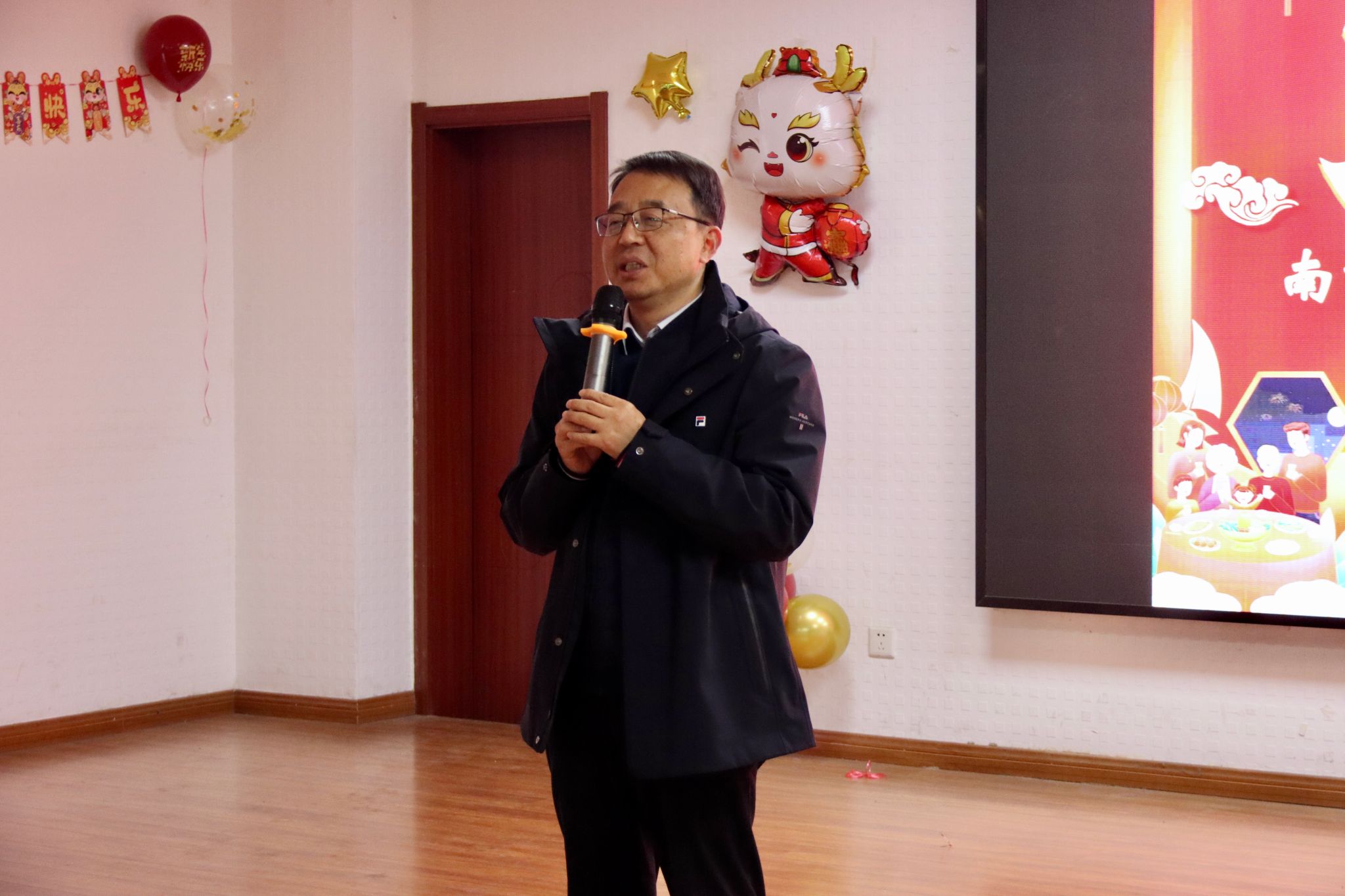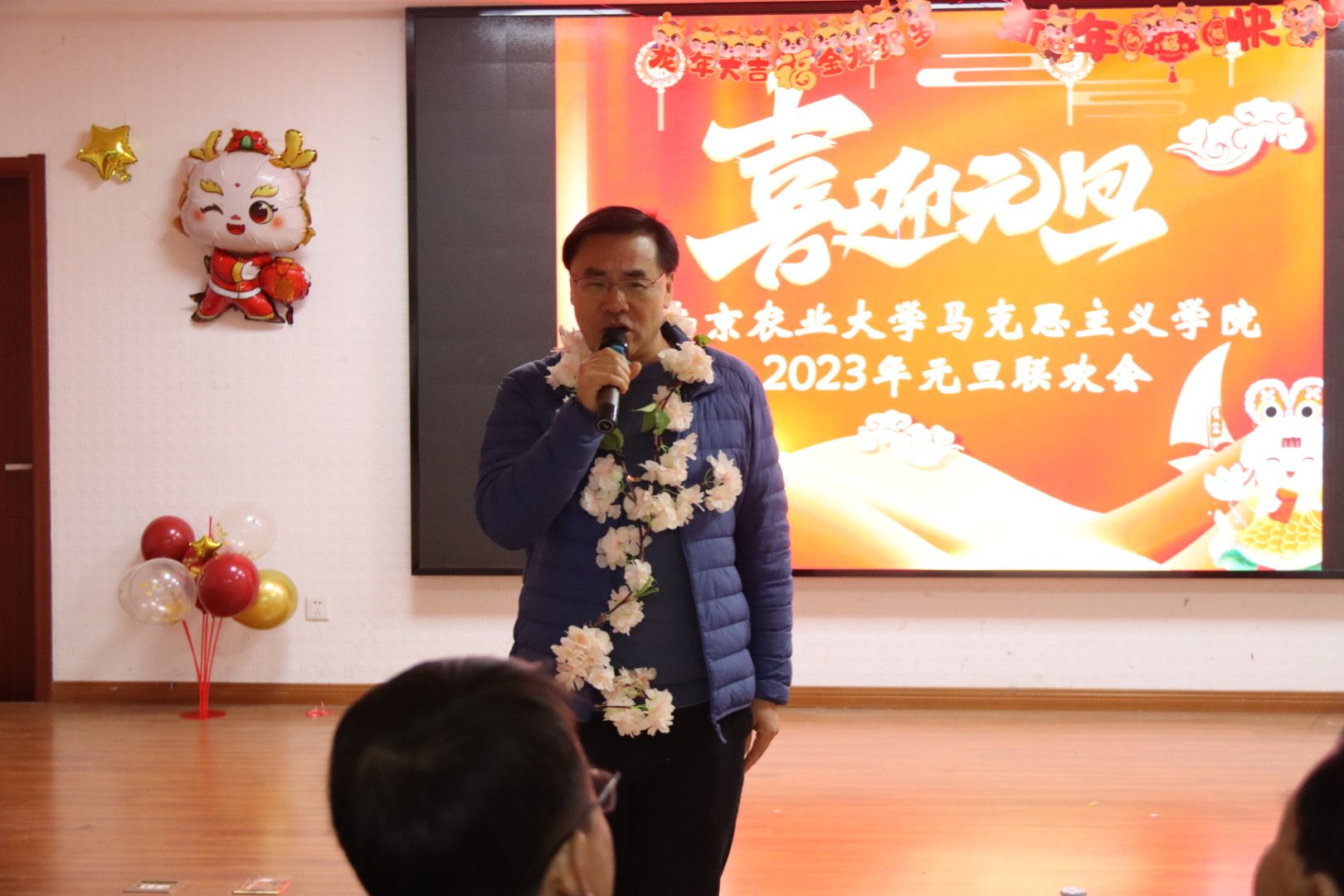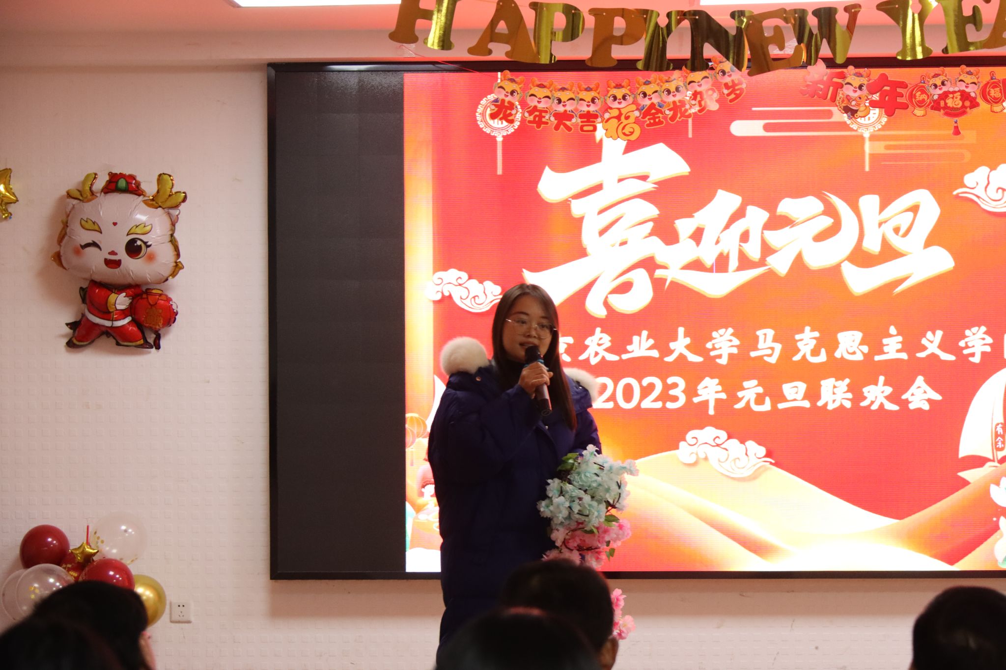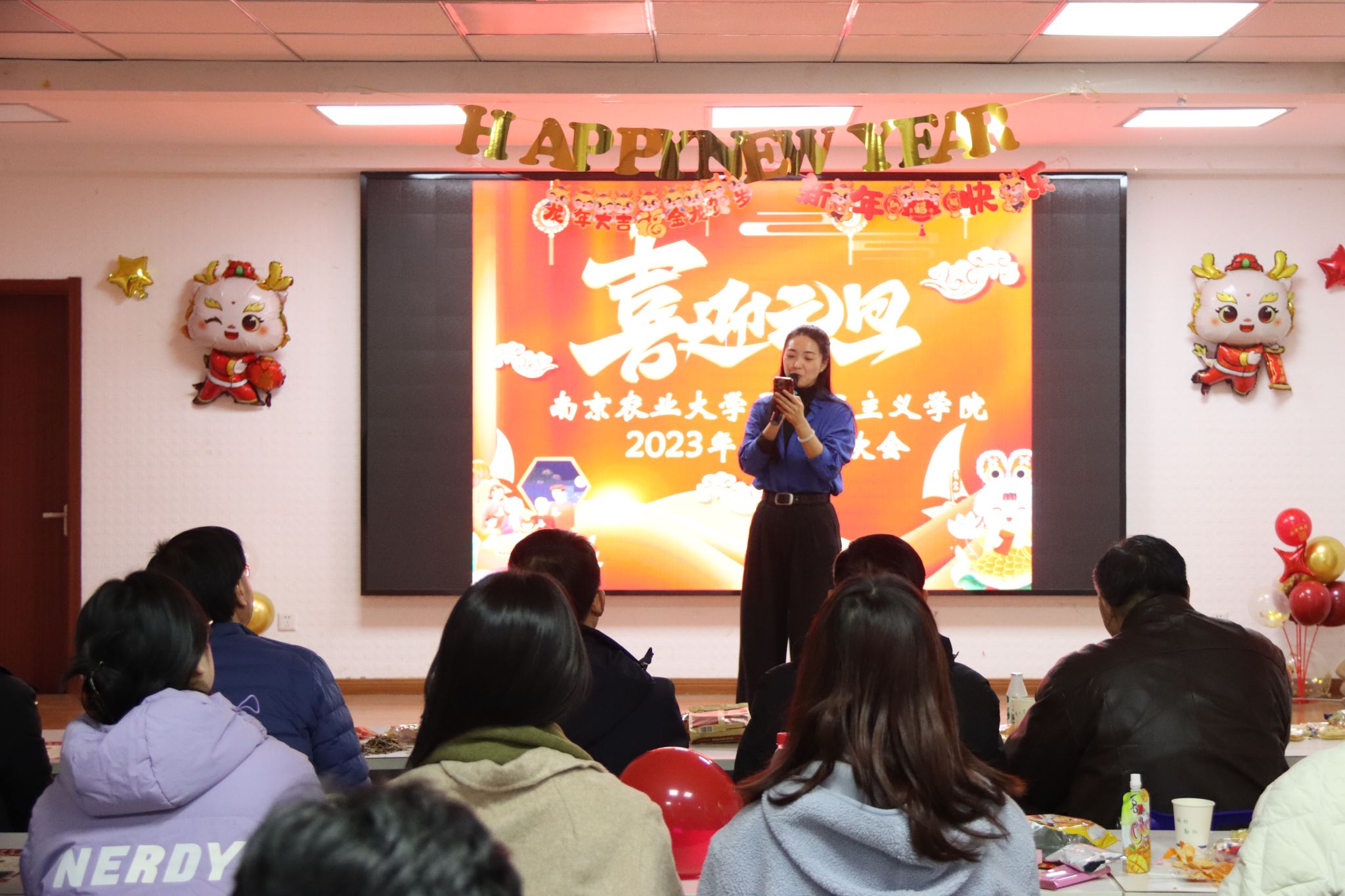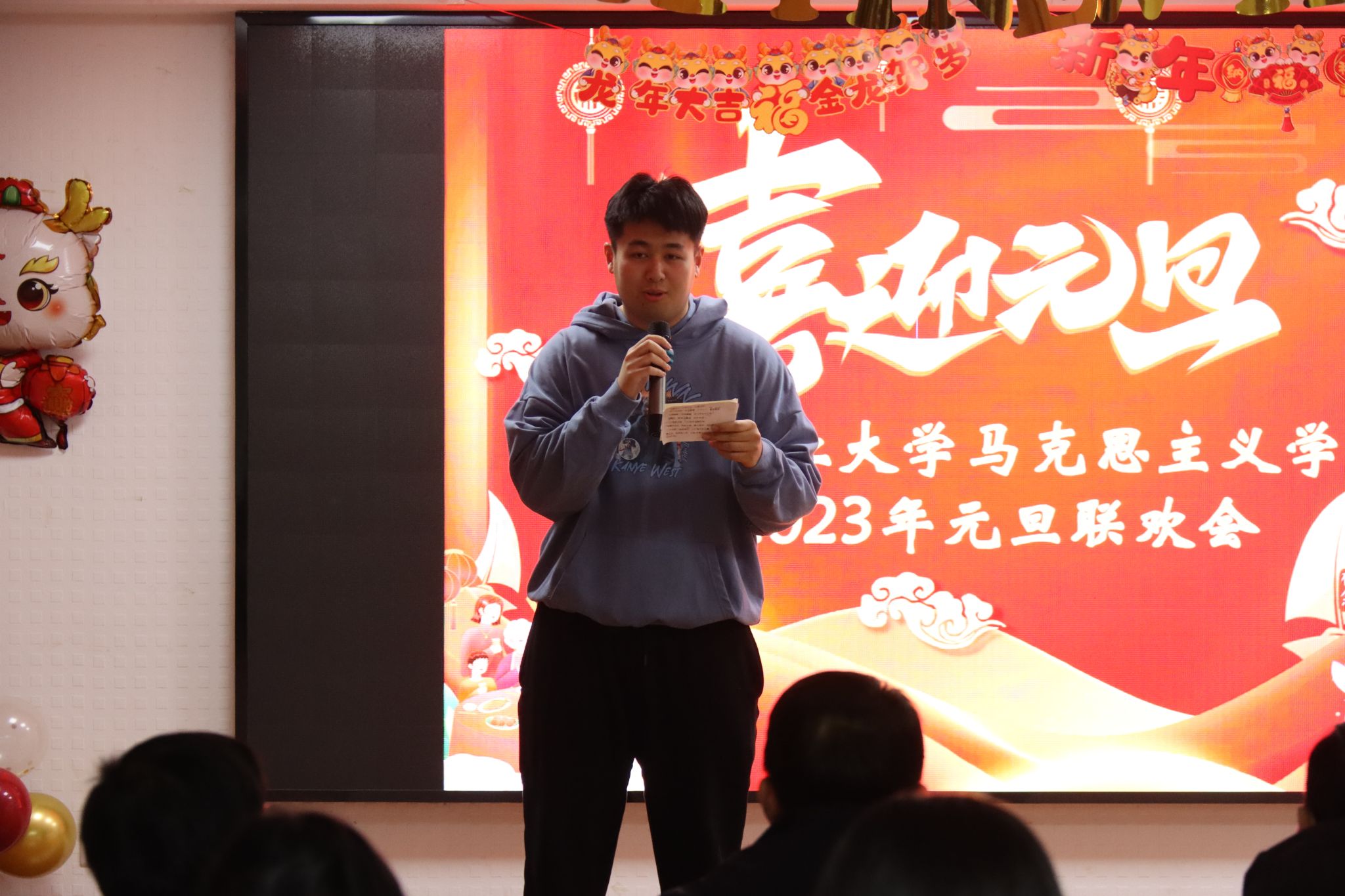 激情点亮元旦,欢乐尽在马院。为庆祝元旦、迎接新年,2023年12月27日下午,成人动漫 “暖冬送旧岁,骏马启新程”元旦联欢晚会在研究生报告厅顺利举行。校党委常委吴群、学院领导、退休教师代表和师生齐聚一堂,共同迎接新一年的到来。