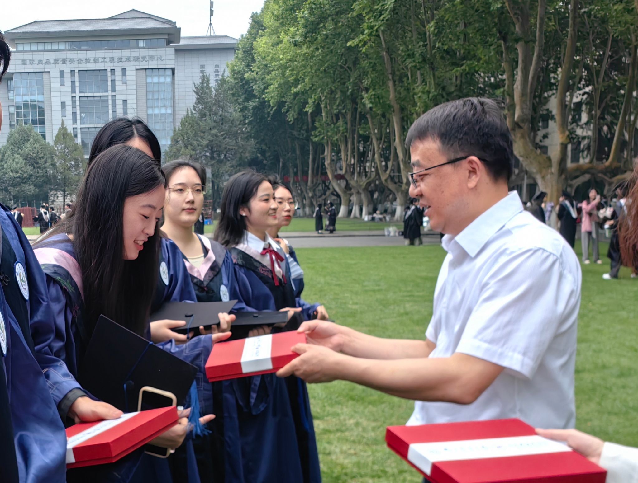 青瓦飞檐依旧在,绿草如茵学子忙。校党委常委吴群、学院全体领导、导师代表、行政人员代表与成人动漫 2024届毕业生在主楼前合影留念。吴群为毕业生赠送毕业纪念品并与毕业生亲切交流。
