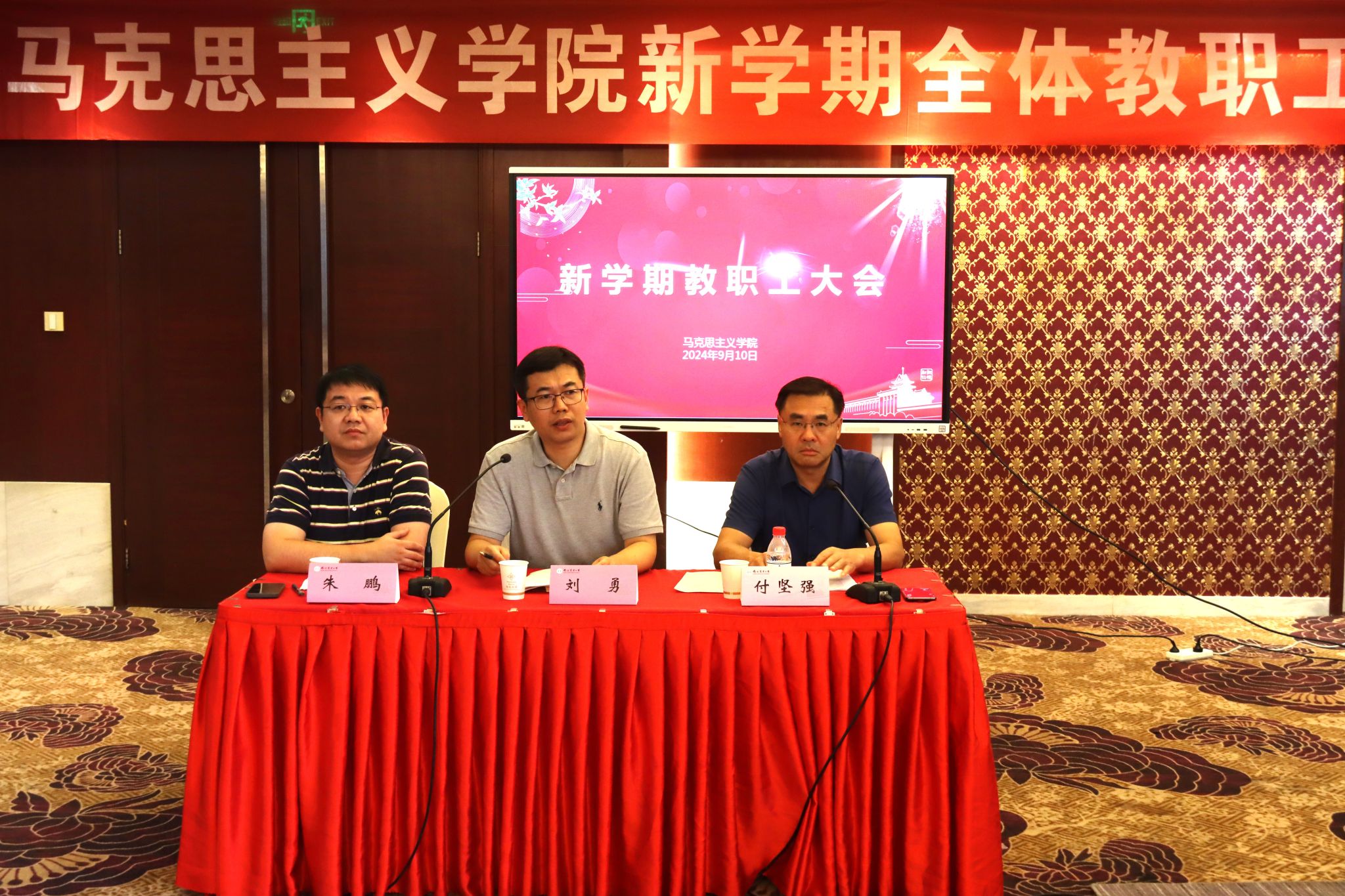 新教师入职仪式上,付坚强为李辉、王豪杰、王欢三位新教师佩戴校徽。新教师们表示,南农马院将是新的起点,在今后的工作中将把握好方向,站稳讲台、站好讲台,努力在教书育人和科研创新上取得优秀业绩。