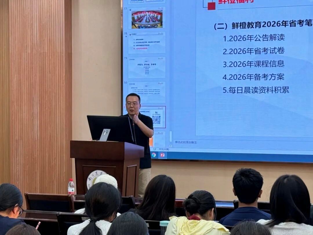 在一个小时的精彩讲座中,韩老师条分缕析、逻辑清晰。他不仅详细讲解历年公务员考试类型,深入剖析公务员考试的六大变化,还结合江苏省情,对当地公务员岗位设置、招录人数以及分数线等关键信息展开细致且全面的解读。其间,他还巧妙设置行测选择题,与同学们积极互动,现场气氛热烈非凡。