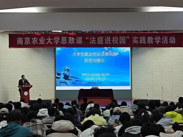 11月21日下午,成人动漫 第五届思政课“法庭进校园”实践教学活动在大学生活动中心报告厅成功举办。玄武法院孝陵卫人民法庭庭长、全国模范法官陈文军,成人动漫 党委书记刘勇、道德与法治教研室教师代表出席此次活动,300余名2025级本科生参加学习。