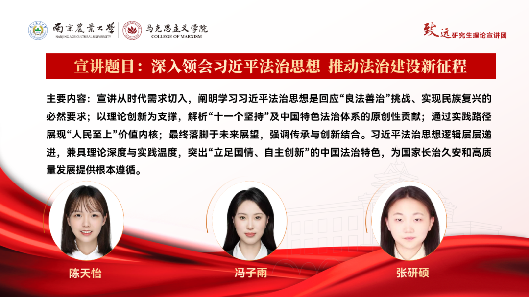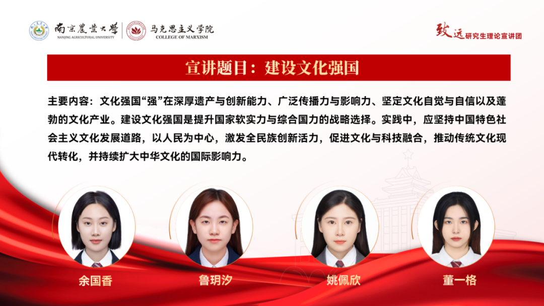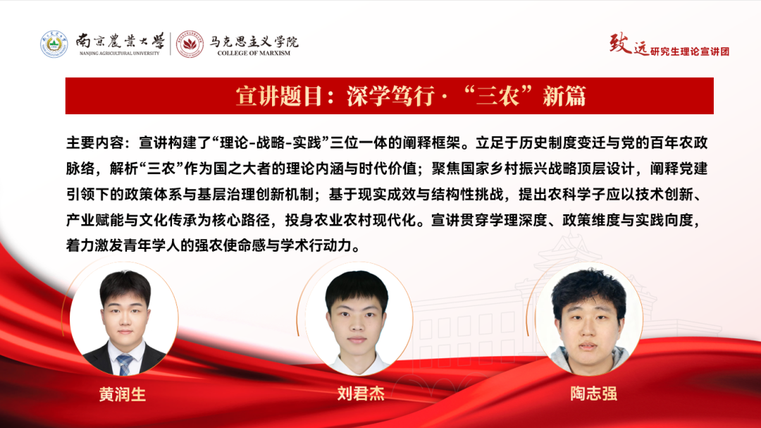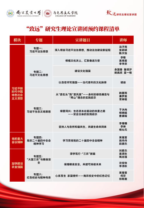 每一场宣讲都是一次思想的碰撞,每一次学习都是一份力量的积蓄。“致远”理论宣讲团带着满满的诚意与优质的内容,静待各学院的预约!让我们以预约为桥,让时代之声浸润校园,让奋进之力激荡人心,共同在强国建设、民族复兴的新征程上书写南农人的精彩答卷!