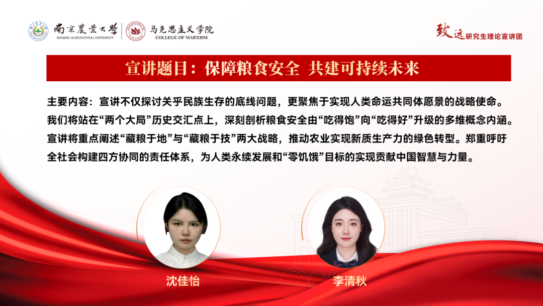 宣讲以“传承南农红色基因,践行强农兴农使命”为目标展开。由习近平总书记的重要论述引入,点明红色校史的精神价值;回溯历史,从南农先贤舍生取义、为民担当、献身科学等故事中,提炼“爱国赤诚、为民情怀”等红色基因内核;讲述新时代南农人的接续奋斗、为建设中国特色社会主义现代化强国贡献南农智慧、南农科技与南农力量;号召南农人承红色之魂,续写强农新篇。