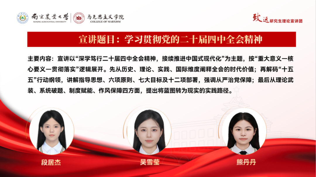 为深入学习贯彻习近平新时代中国特色社会主义思想,贯彻落实党的二十届四中全会精神,马院“致远”研究生理论宣讲团推出“预约制精准宣讲”活动,以“学生点单、宣讲团配送”的定制化模式,将优质宣讲资源精准送达师生。