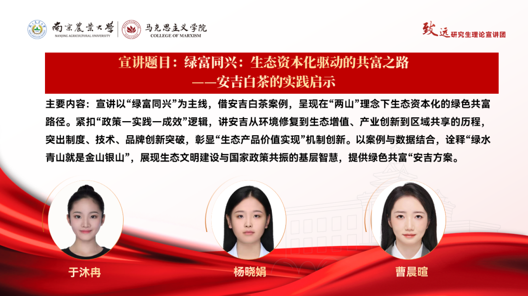 宣讲以“绿富同兴”为主线,借安吉白茶案例,呈现在“两山”理念下生态资本化的绿色共富路径。紧扣“政策—实践—成效”逻辑,讲安吉从环境修复到生态增值、产业创新到区域共享的历程,突出制度、技术、品牌创新突破,彰显“生态产品价值实现”机制创新。以案例与数据结合,诠释“绿水青山就是金山银山”,展现生态文明建设与国家政策共振的基层智慧,提供绿色共富“安吉方案”。