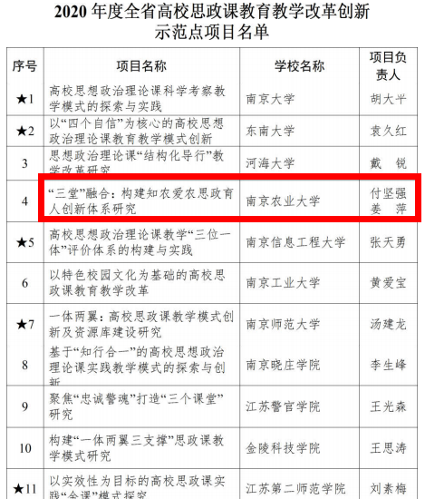 近日,江苏省教育厅下发了《关于公布2020年度全省高校示范成人动漫 及思政课教育教学改革创新示范点项目遴选结果的通知》(苏教社政函〔2020〕15号),成人动漫 申报的《“三堂”融合:构建知农爱农思政育人创新体系研究》获批首批江苏省高校思政课教育教学改革创新示范点项目。