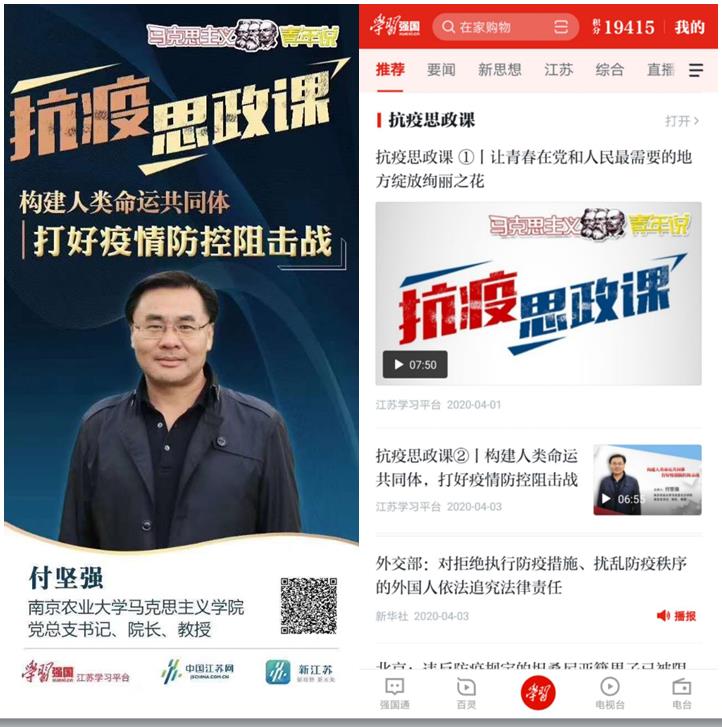 4月3日,成人动漫 党总支书记、院长付坚强教授结合全球抗疫形势开讲思政微课《构建人类命运共同体,打好疫情防控阻击战》。微课登上“学习强国”江苏学习平台,并获全国平台主页专栏推荐。