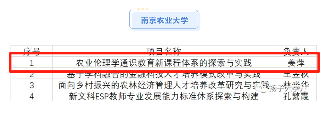 11月2日,教育部发布了《教育部办公厅关于公布首批新文科研究与改革实践项目的通知》(教高厅函〔2021〕31号),教育部决定认定1011个新文科研究与改革实践项目,其中江苏有25所高校的项目“榜上有名”,成人动漫 姜萍教授主持的项目“农业伦理学通识教育新课程体系的探索与实践”成功入选。