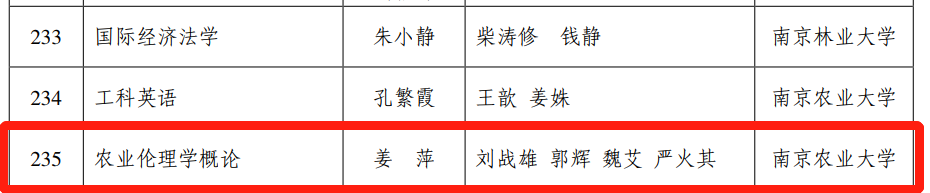 近日,江苏省教育厅发布了《省教育厅关于公布首批省级一流本科课程认定结果的通知》(苏教高函〔2021〕9号),公布了首批省级一流本科课程名单,由成人动漫 姜萍教授负责,严火其教授、刘战雄副教授和魏艾副教授参与的课程《农业伦理学概论》获得“首批省级一流本科课程(线下课程)”荣誉。