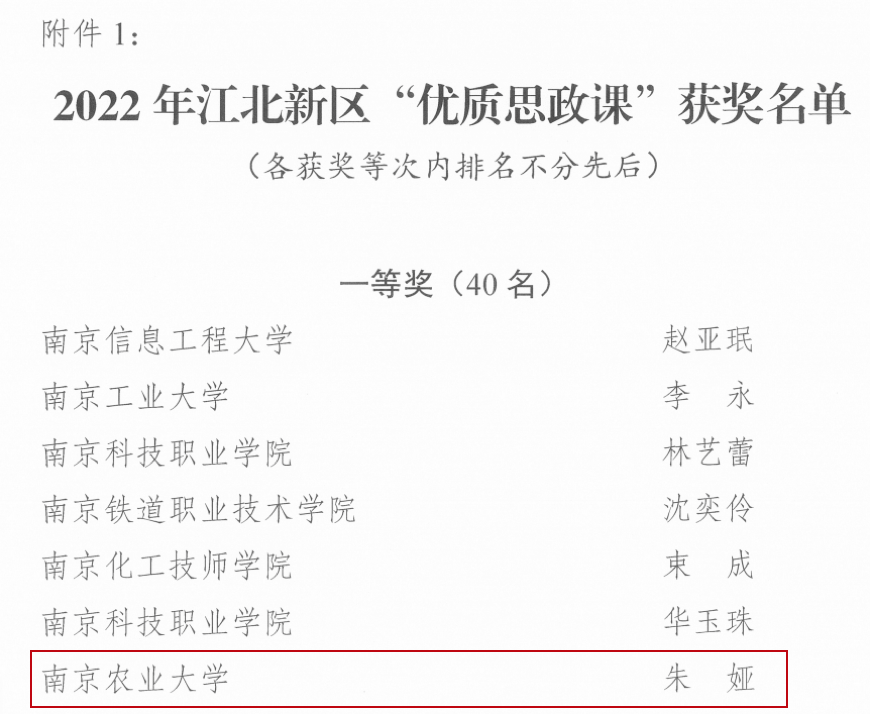 近日,成人动漫 朱娅教授的“贯彻新发展理念,推进江北新区高质量发展”课程案例获得2022年江北新区“优质思政课”一等奖。