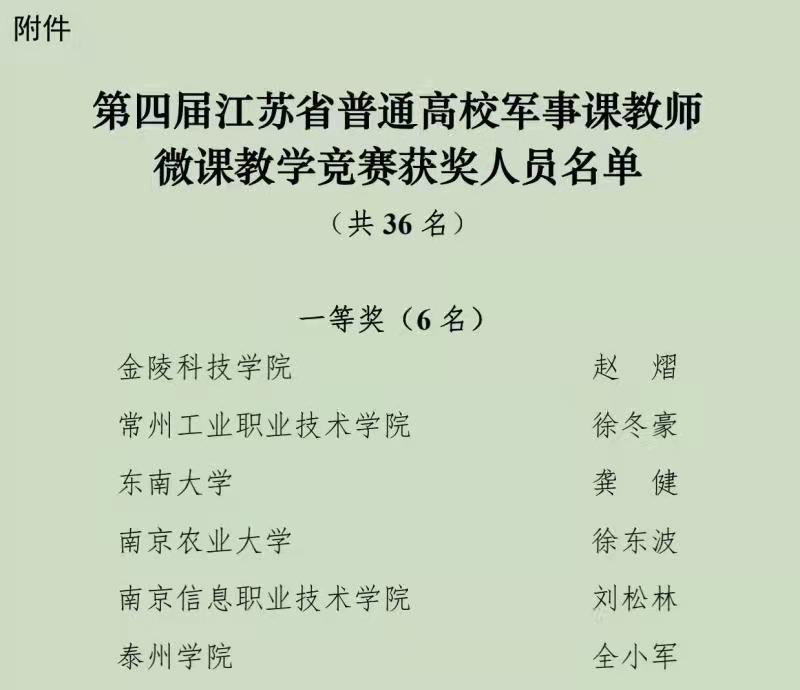 2022年1月8日,第四届江苏省普通高校军事课教师微课教学竞赛决赛在南京师范大学仙林校区国际学术交流中心举办,成人动漫 教师徐东波副教授以其“军民融合的主要动因”微课获得一等奖。遵照现行相关规定,本次竞赛受省教育厅委托,由江苏省普通高等学校军事课教学指导委员会主办,南京师范大学承办。总共有来自全省37所高校的65位参赛教师参加比赛,专家评委们根据参赛教师的参赛视频、教学课件、教学方案进行了评审,最终确定36位教师进入本次决赛。