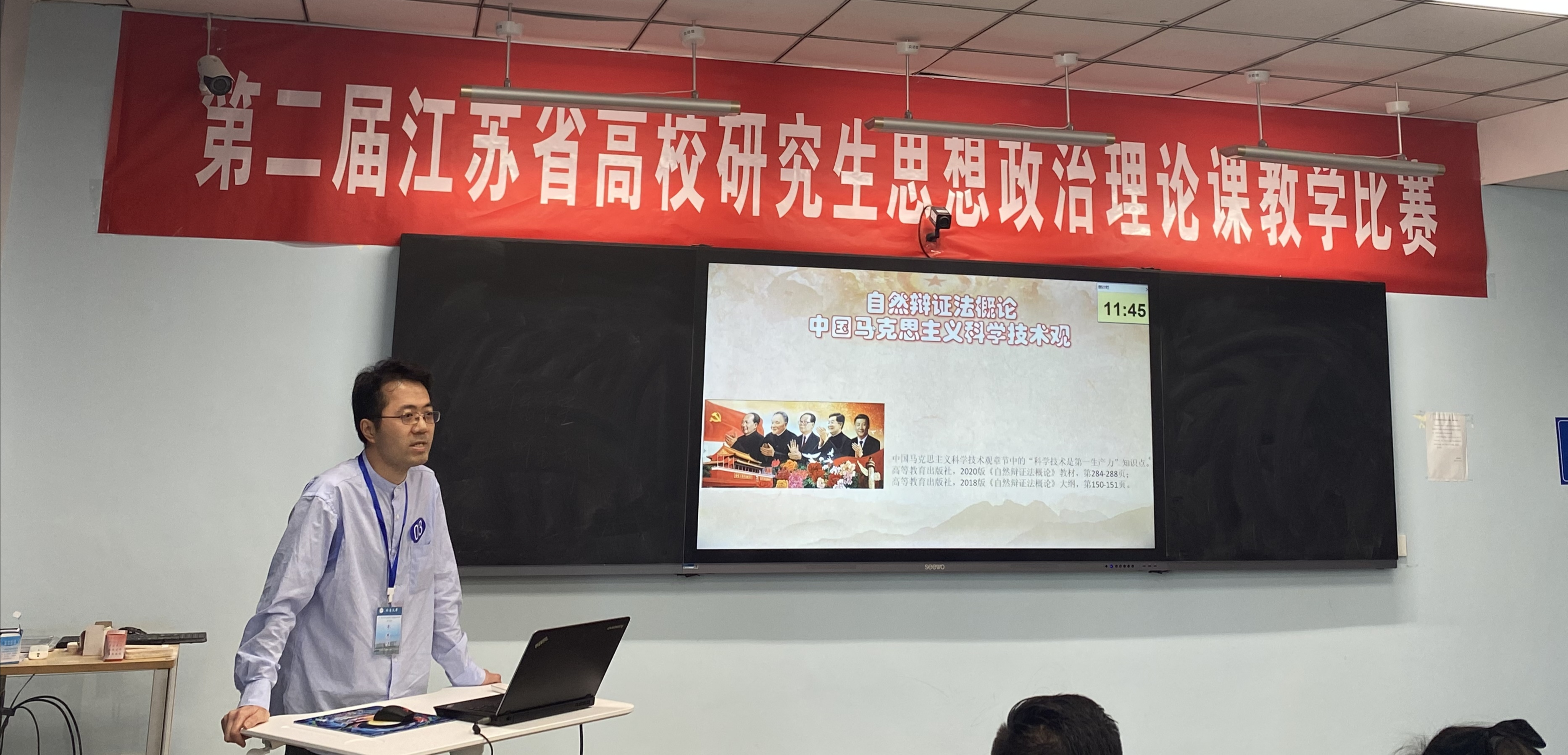 此次比赛分“中国特色社会主义理论与实践研究”和“自然辩证法概论及研究生其他思政课综合组”两个小组进行。参赛选手根据课程教学内容进行现场授课和现场答辩,评委由专家评委和学生代表评委组成。为确保比赛公平、公开、公正性,所有选手均采取匿名形式,在讲课、PPT课件和现场答辩等环节均不得透露个人信息。经过激烈角逐,石诚老师讲授的“科学技术是第一生产力思想的形成与发展”专题荣获综合组特等奖。
