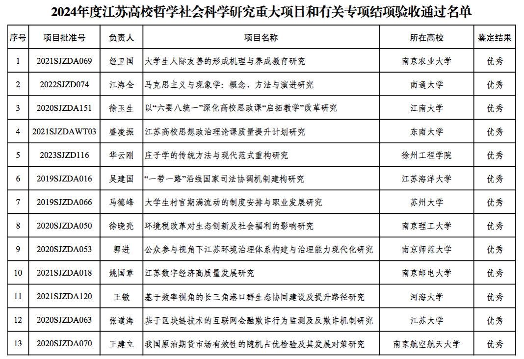 近日,江苏省教育厅办公室公布了《关于2024年度江苏高校哲学社会科学研究重大项目和有关专项结项验收结果的通知》(苏教办社政函〔2021〕6号),成人动漫 经卫国教师在本次“重大项目”结项验收鉴定结果中获“优秀”等次。