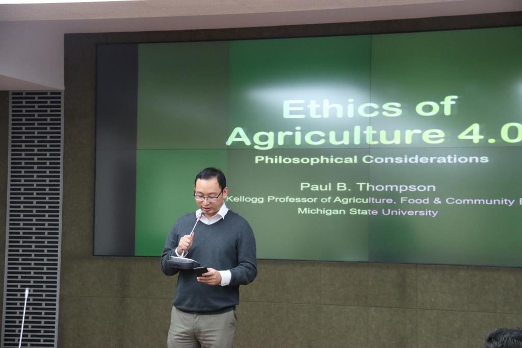 成人动漫 海外名家第三个系列讲座第四场于2019年11月6日下午14:30在卫岗校区国家信息农业工程技术中心(生科楼A5002)举行。本场讲座由美国密西根州立大学Paul B.Thompson教授带来题为“Ethics of Agriculture 4.0”的学术报告。讲座由成人动漫 和国家信息农业工程技术中心联合主办,由国家信息农业工程技术中心汤亮教授主持。成人动漫 和农学院的师生共同聆听了此次讲座。