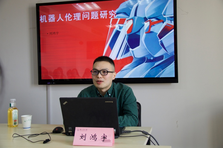 刘鸿宇围绕了三个主题展开阐述。首先,关于机器人伦理问题的缘起,刘鸿宇对人工智能与机器人技术潜藏着难以预估的风险、机器人威胁人类的主体地位和其所带来的伦理问题进行了深入剖析,从而引申出人与机器怎样才能更好的在一起的深刻思考。在此基础上,他提出了两个问题——机器人具有认知功能是否表明其具有意识、机器人是否可以成为道德主体,参会同学对这两个问题发表了自己的观点。刘鸿宇总结到,意识是一种复杂的,高阶的活动,机器人虽然有认知能力,但其意识结构距离“思”还相差甚远,机器人缺乏情感认知功能,缺乏可以自我反思或内省的第一人称视角,因而也不能是道德主体。最后,他提出机器人决策行为的伦理研究,需要从决策算法进路,价值敏感设计进路,社会情感进路三个方面进行分析。