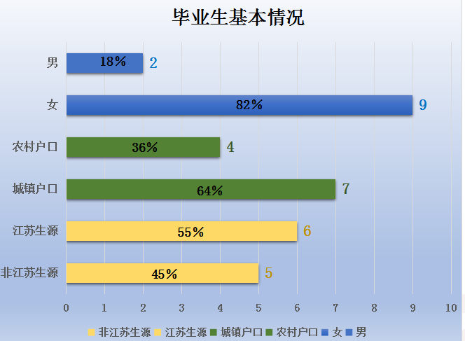 成人动漫 2019届毕业硕士研究生11人。其中男生2人,占18%;女生9人,占82%;农村户口4人,占36%;城镇户口毕业生7人,占64%。其中江苏省生源6人,占55%,非江苏省生源5人,占45%。