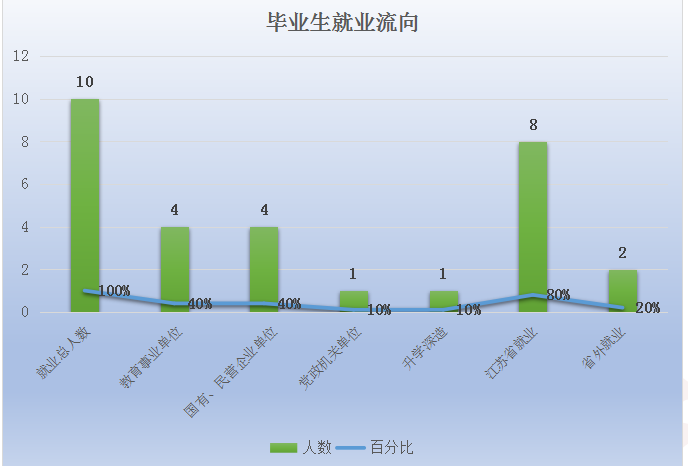 截至2019年12月20日,成人动漫 2019届毕业生整体就业趋向高校科研单位和中小学等科技教育事业单位,签约就业的10人中,有2人在高校就职,2人在中小学就职。占总就业的40%,国有、民营企业单位就职4人,占总就业的40%,党政机关单位就业1人,占总就业的10%,升学深造1人,占总就业的10%。江苏省就业8人,占总就业的80%,外省就业2人,占总就业的20%。