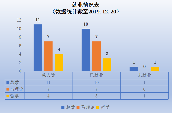 截至2019年8月31日,成人动漫 2019届毕业生初次就业8人,就业率81.82%,截至2019年12月20日,成人动漫 2019届毕业生就业10人,就业率90.91%。其中马克思主义理论硕士点7人,全部就业,就业率100%,哲学硕士点有一人因事业单位考试原因暂缓就业,就业率80%。